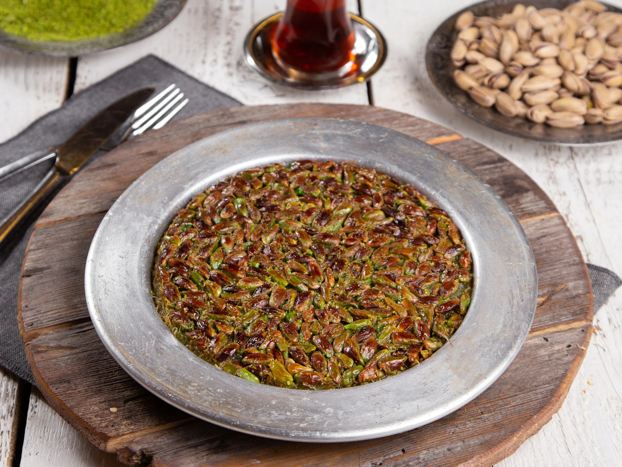 İncecik açılan hamurun içine kaymak ve Antep fıstığının cömertçe serpilmesiyle