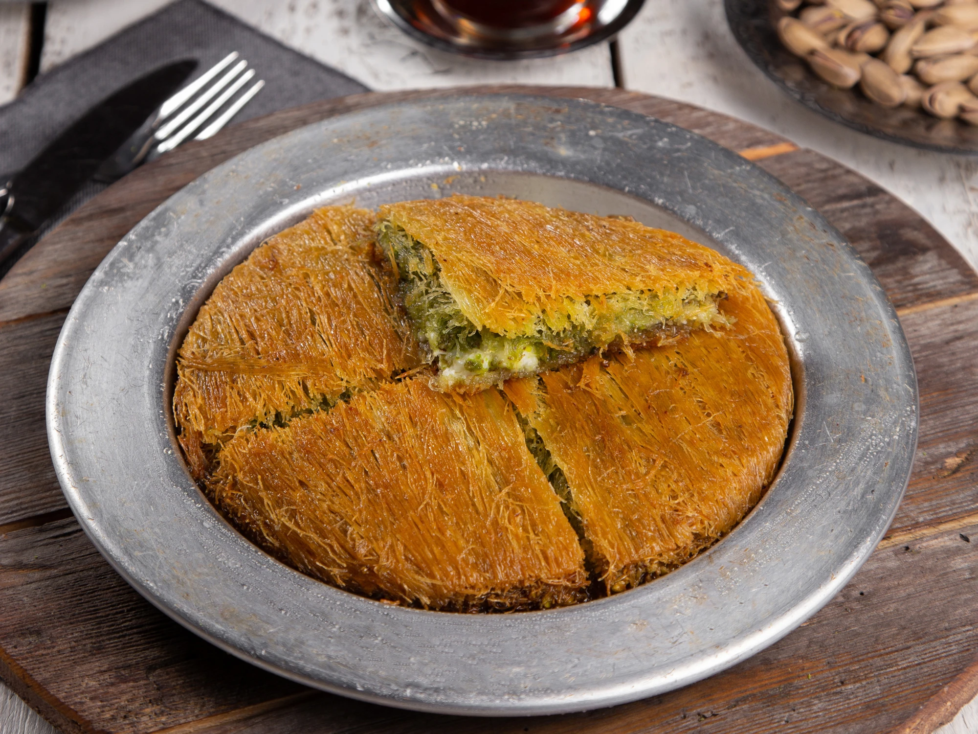 Tel tel kızarmış kadayıfın içinde eriyen özel peyniri ve bol Antep fıstığıyla